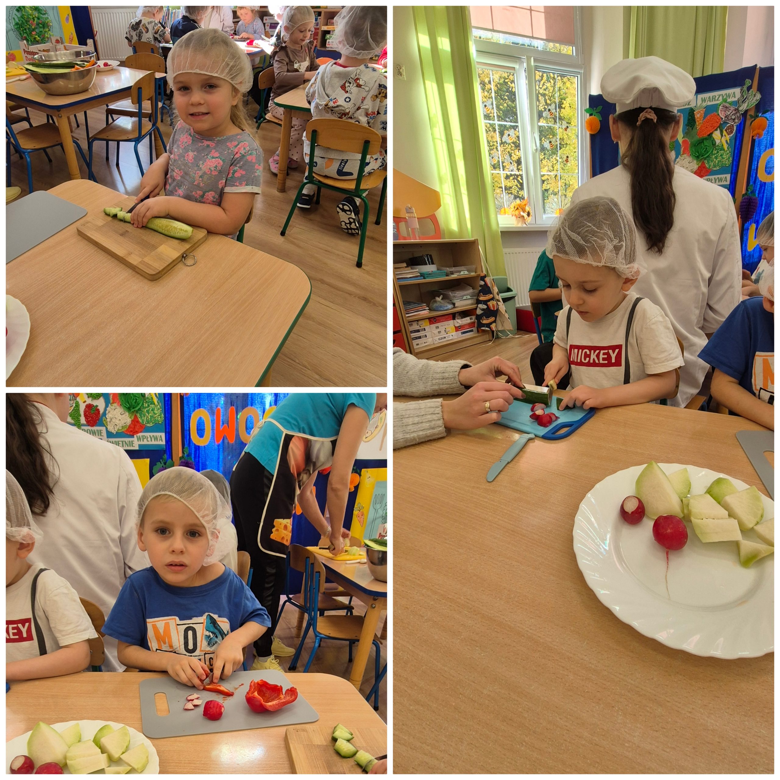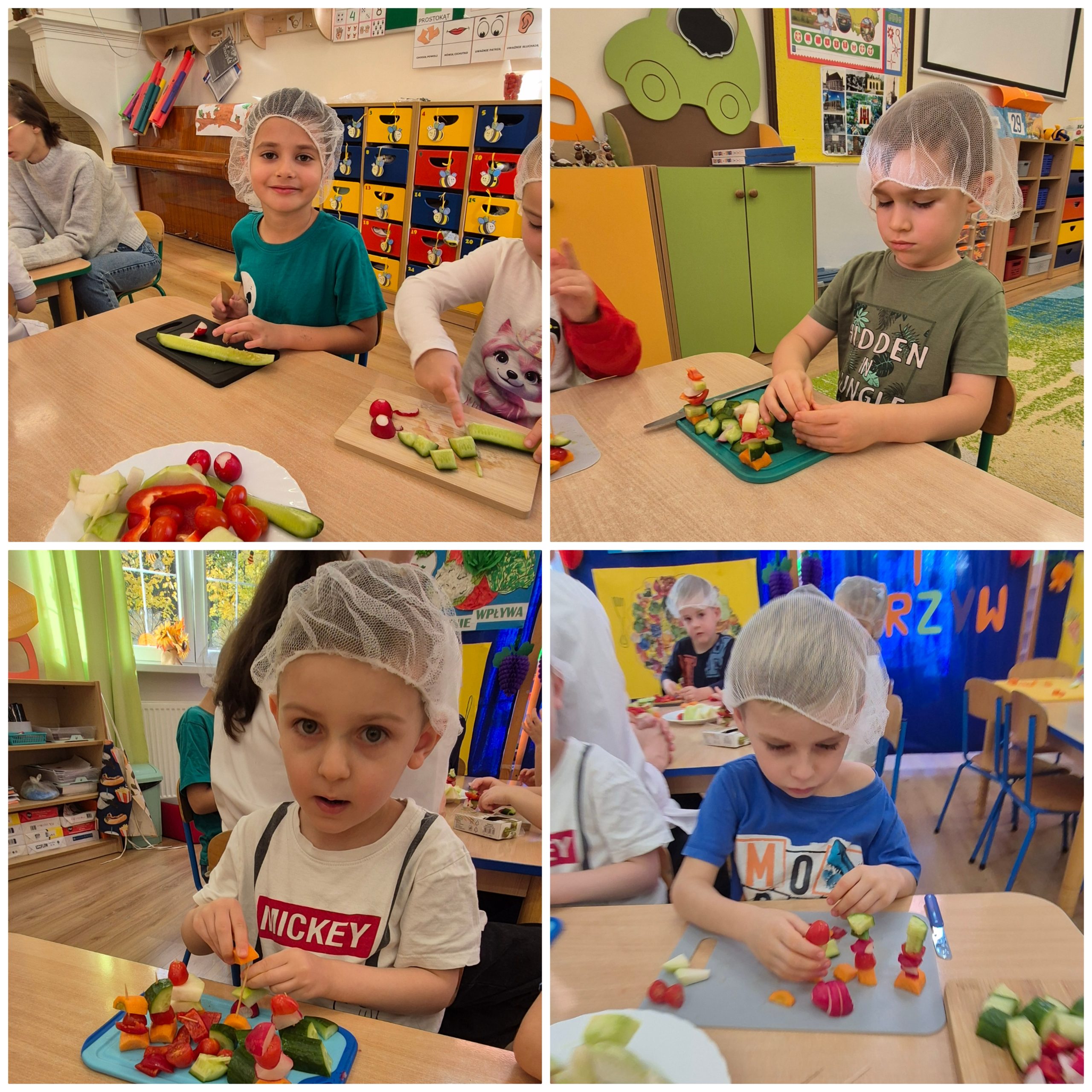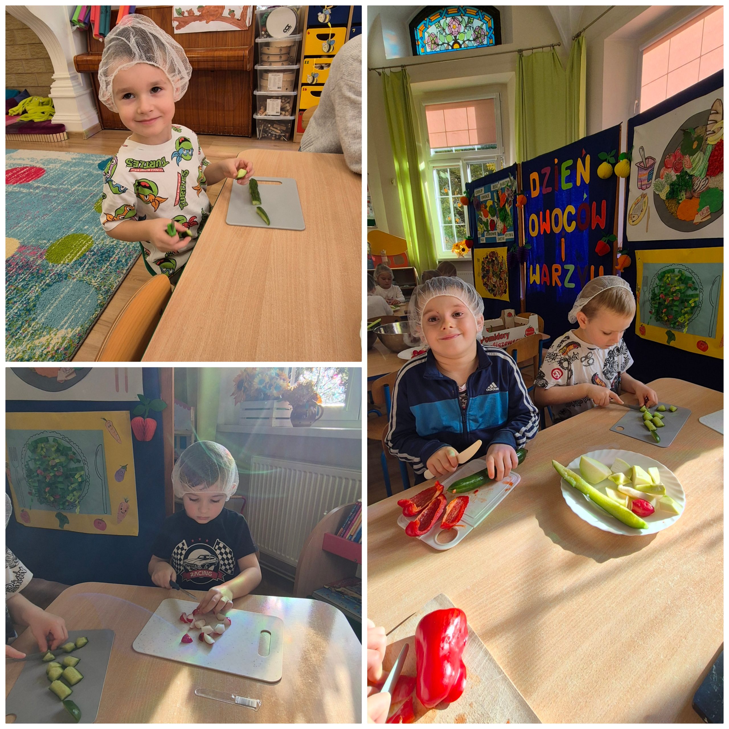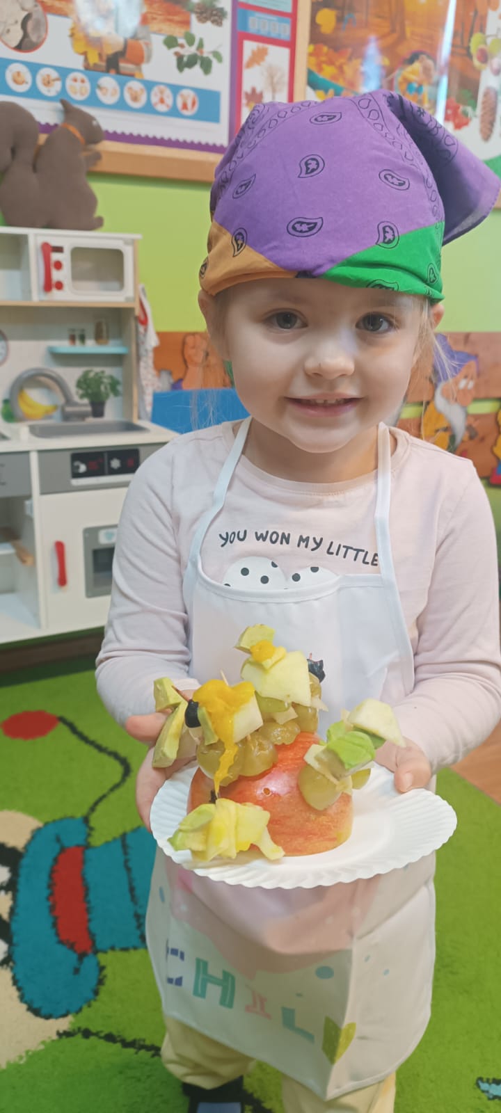 29 października w naszym przedszkolu obchodziliśmy Dzień Owoców i Warzyw – pełen kolorów, smaków i witamin! Dzieci uczestniczyły w warsztatach kulinarnych, podczas których przygotowywały warzywne owocowe koreczki, sałatkę warzywną oraz świeżo wyciskane soki. Każdy przedszkolak mógł spróbować swoich sił w krojeniu, mieszaniu i komponowaniu zdrowych przysmaków.