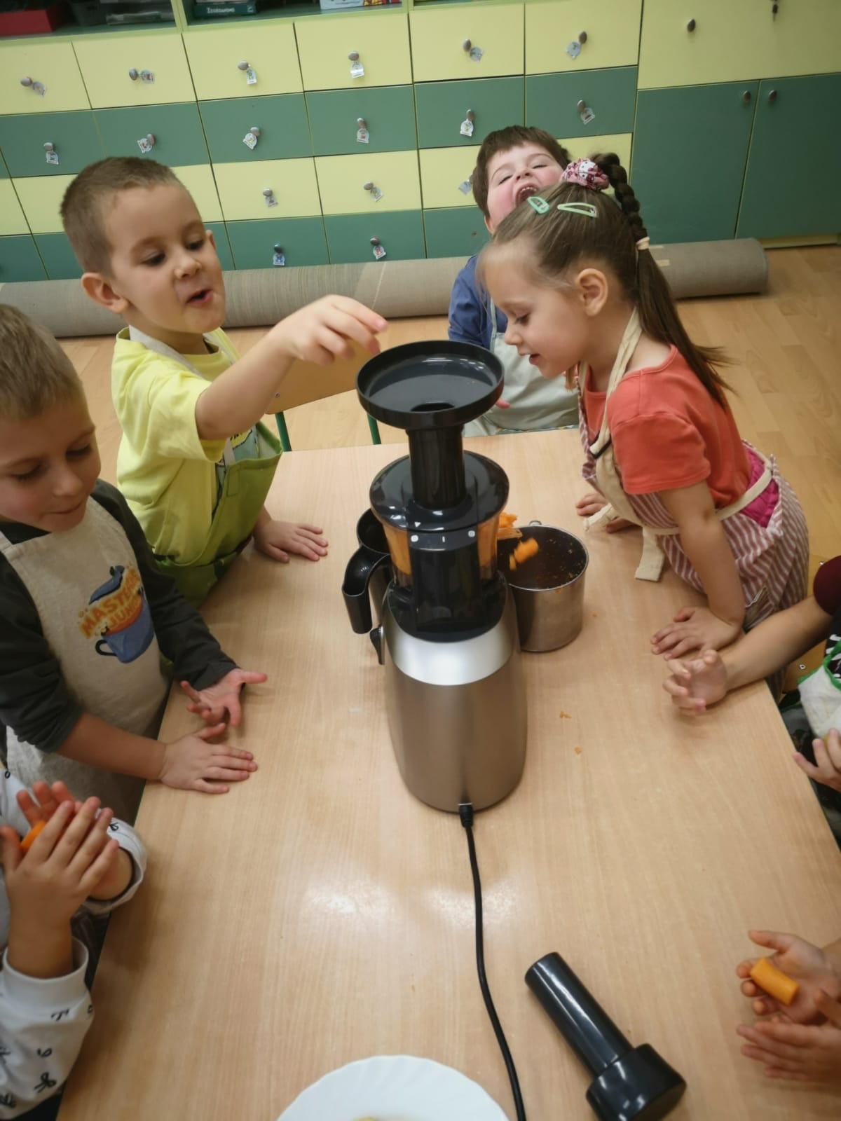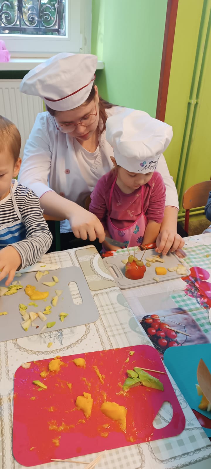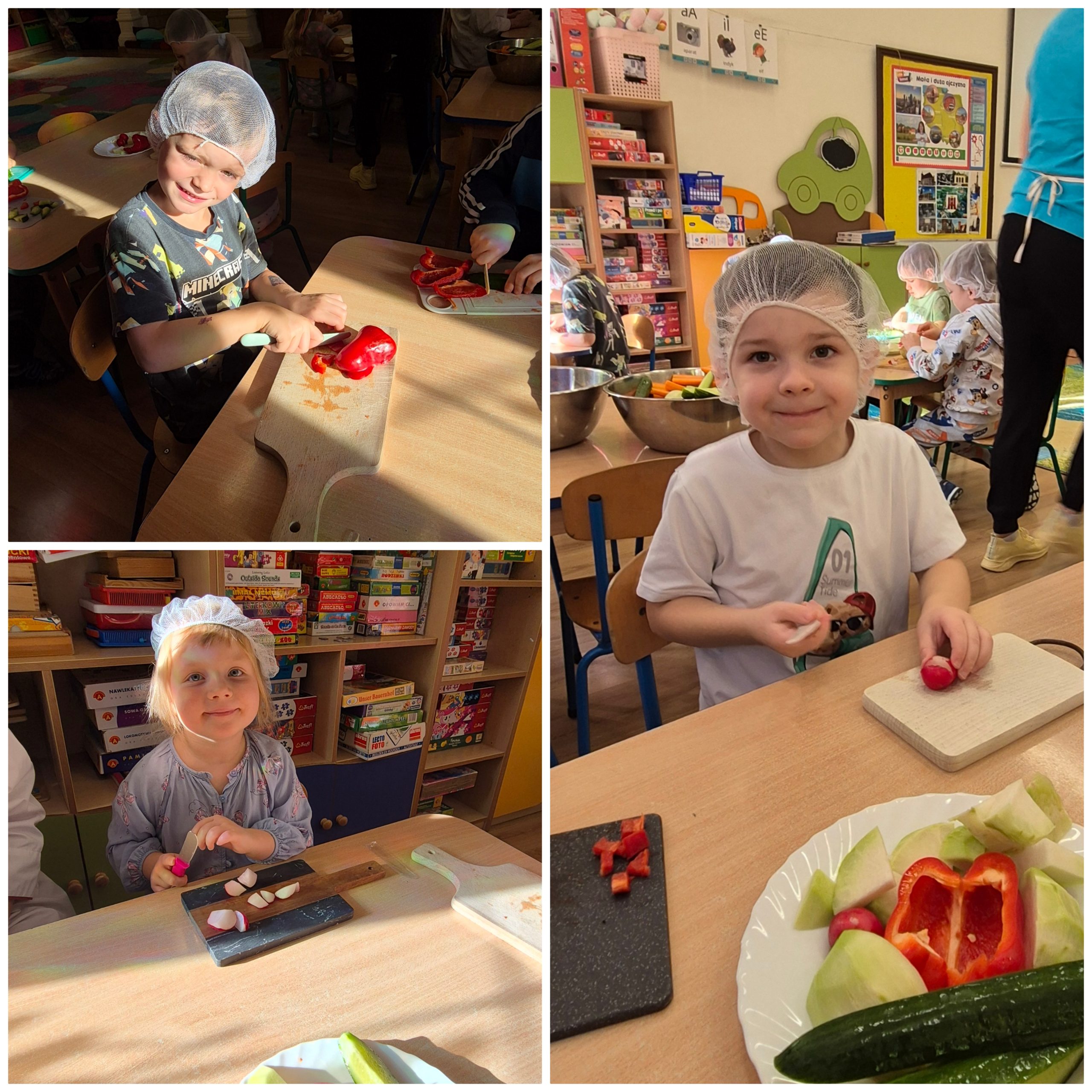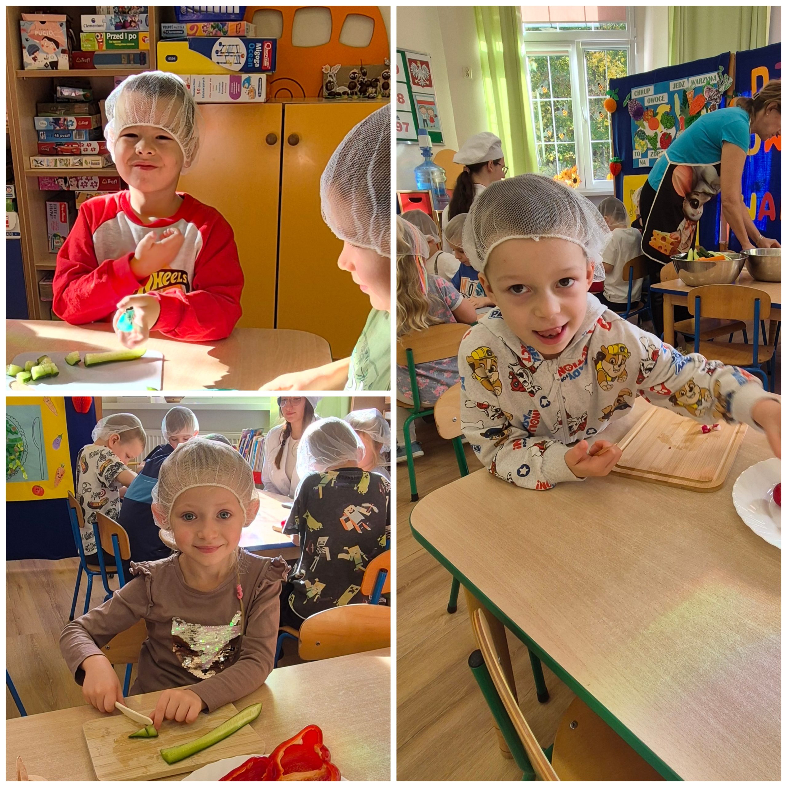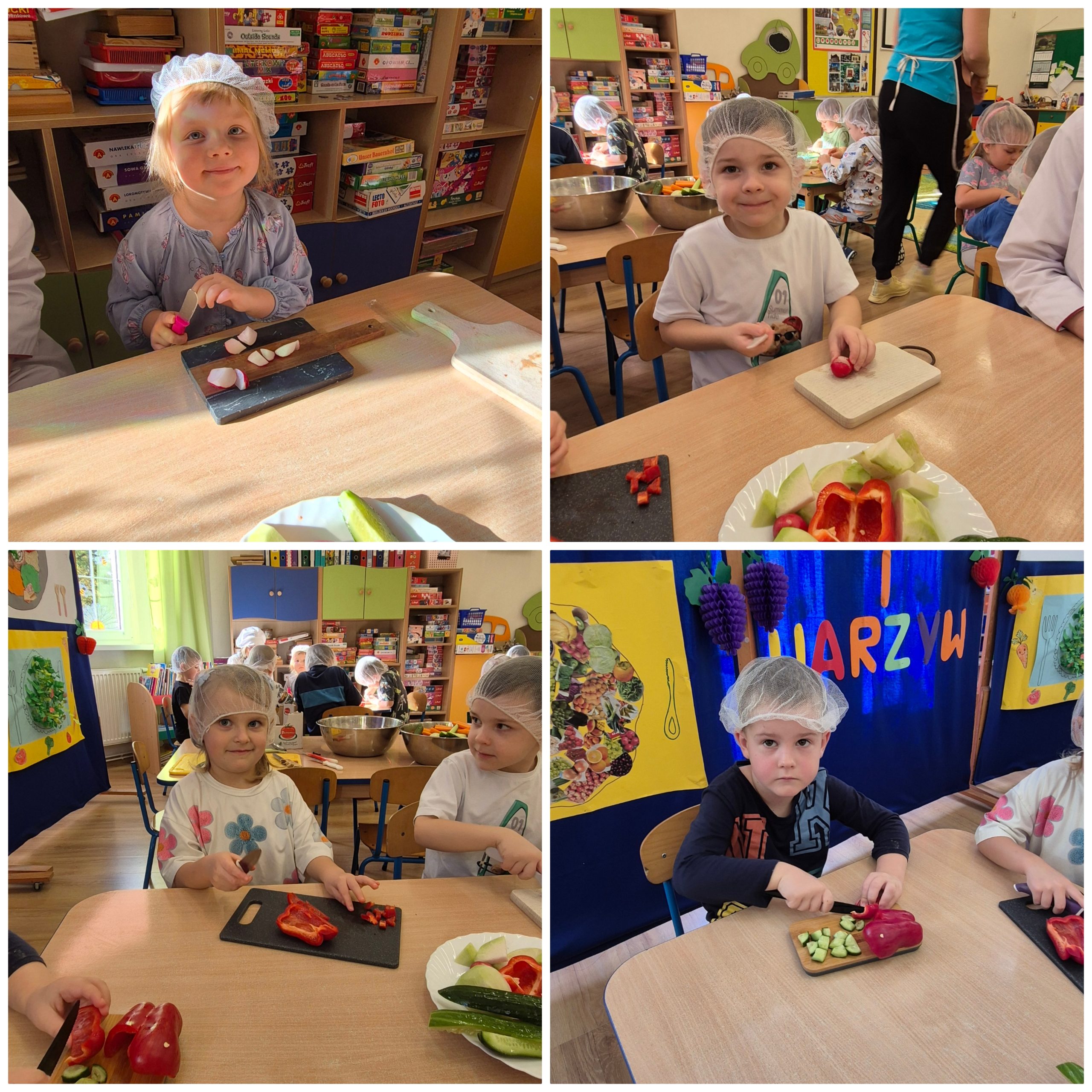 29 października w naszym przedszkolu obchodziliśmy Dzień Owoców i Warzyw – pełen kolorów, smaków i witamin! Dzieci uczestniczyły w warsztatach kulinarnych, podczas których przygotowywały warzywne owocowe koreczki, sałatkę warzywną oraz świeżo wyciskane soki. Każdy przedszkolak mógł spróbować swoich sił w krojeniu, mieszaniu i komponowaniu zdrowych przysmaków.