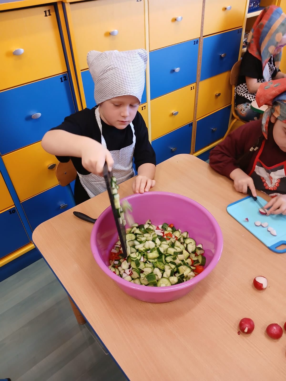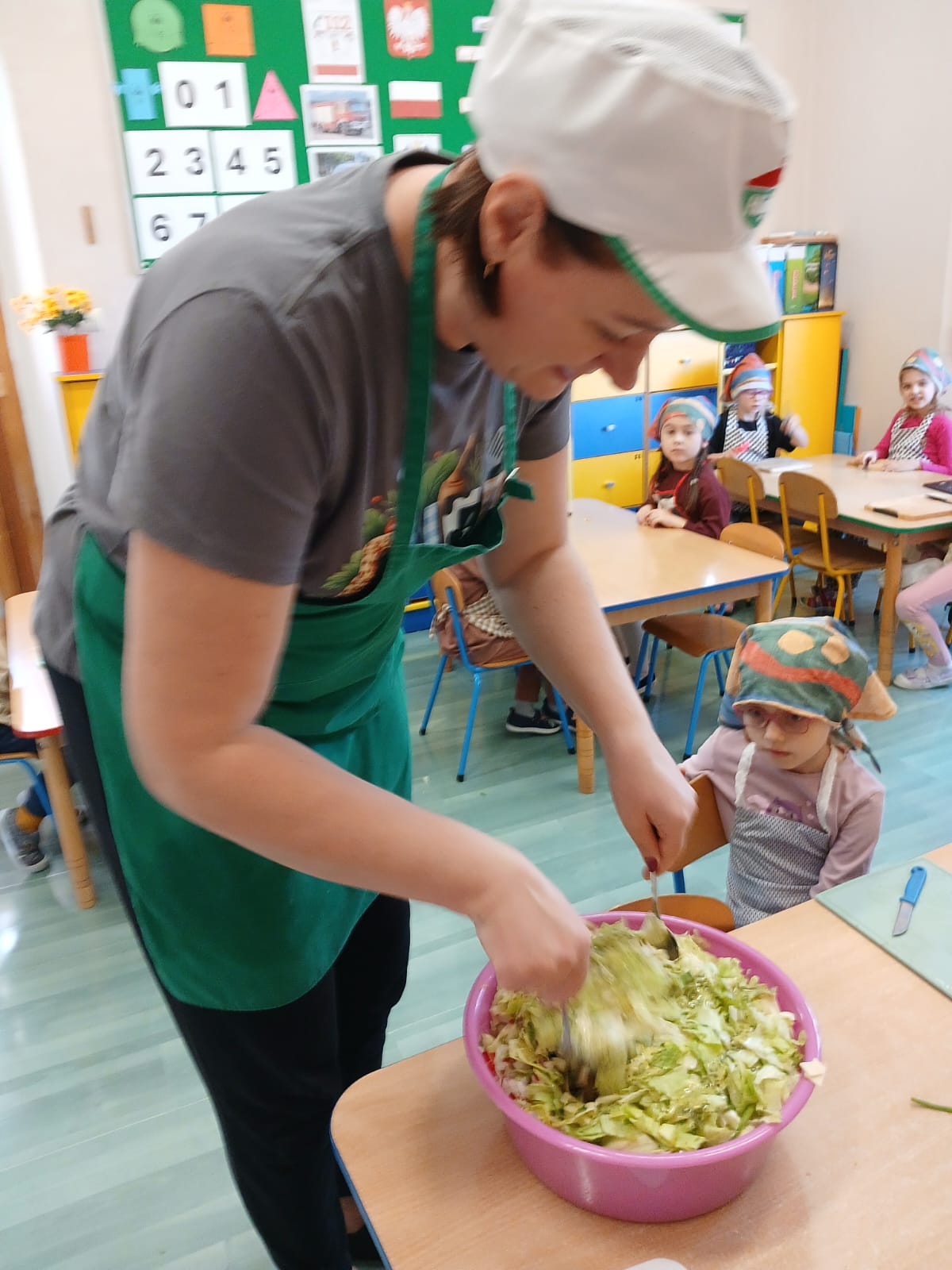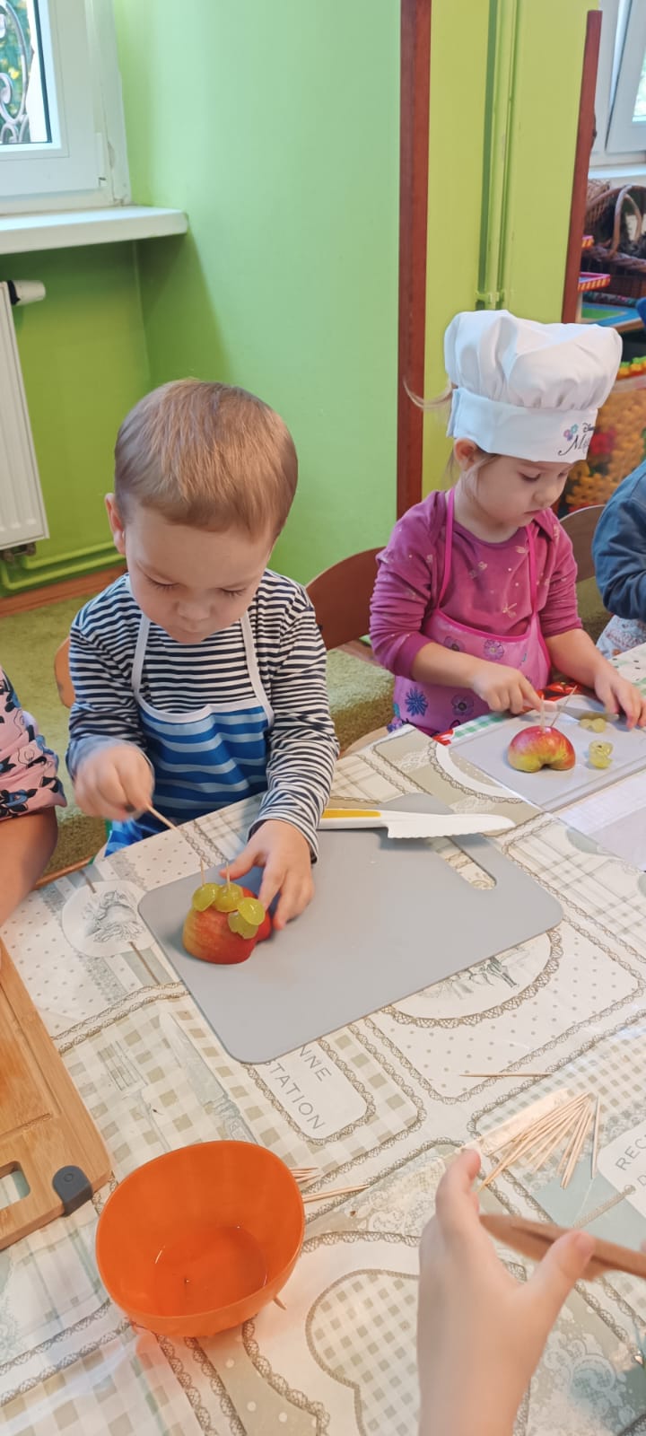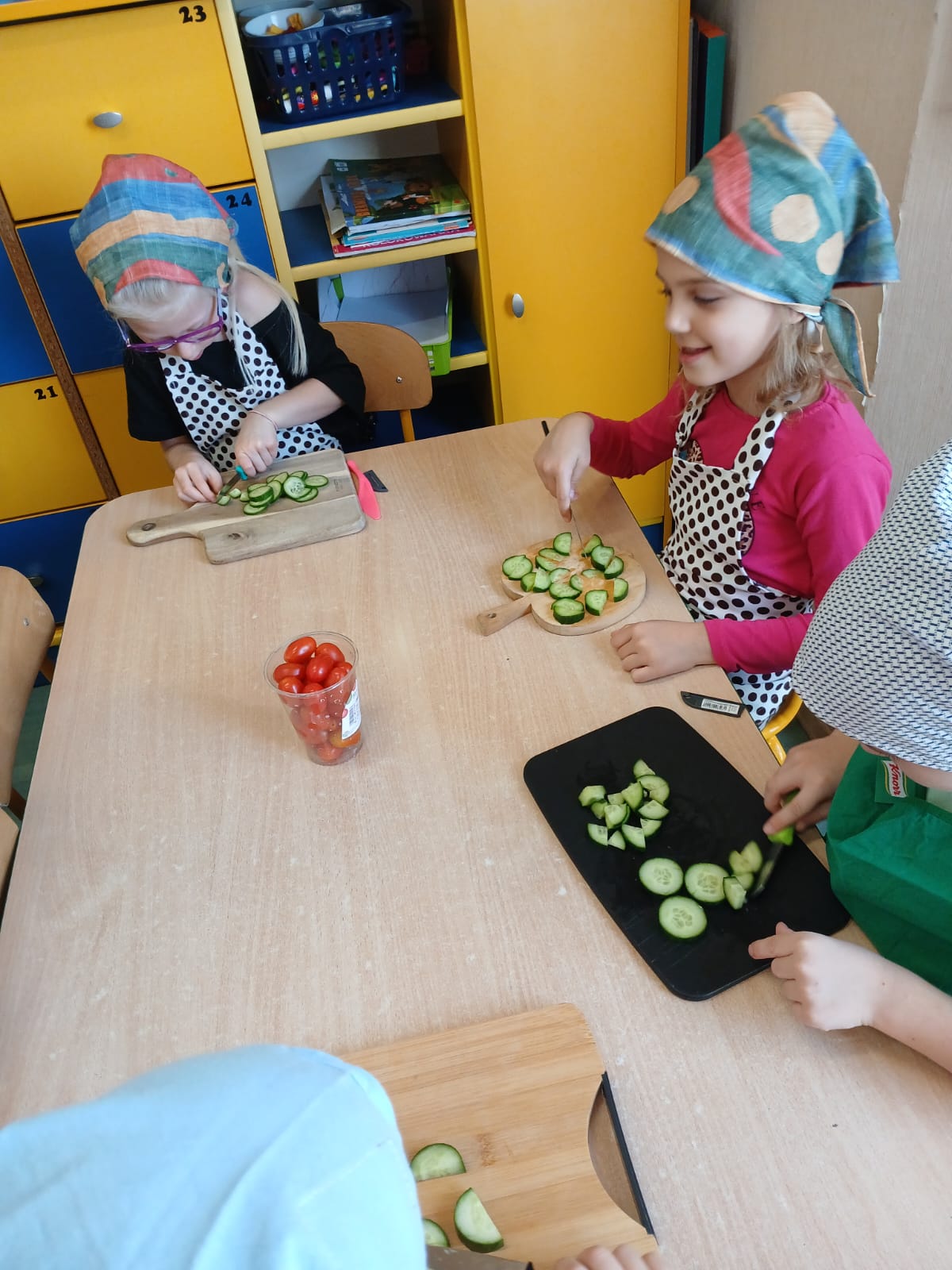Mieliśmy również w tym dniu wyjątkowych gości – uczniów z Europejskiego Centrum Kształcenia Zawodowego i Ustawicznego w Gubinie. Uczniowie pomagali naszym przedszkolakom w przygotowywaniu kulinarnych przysmaków.