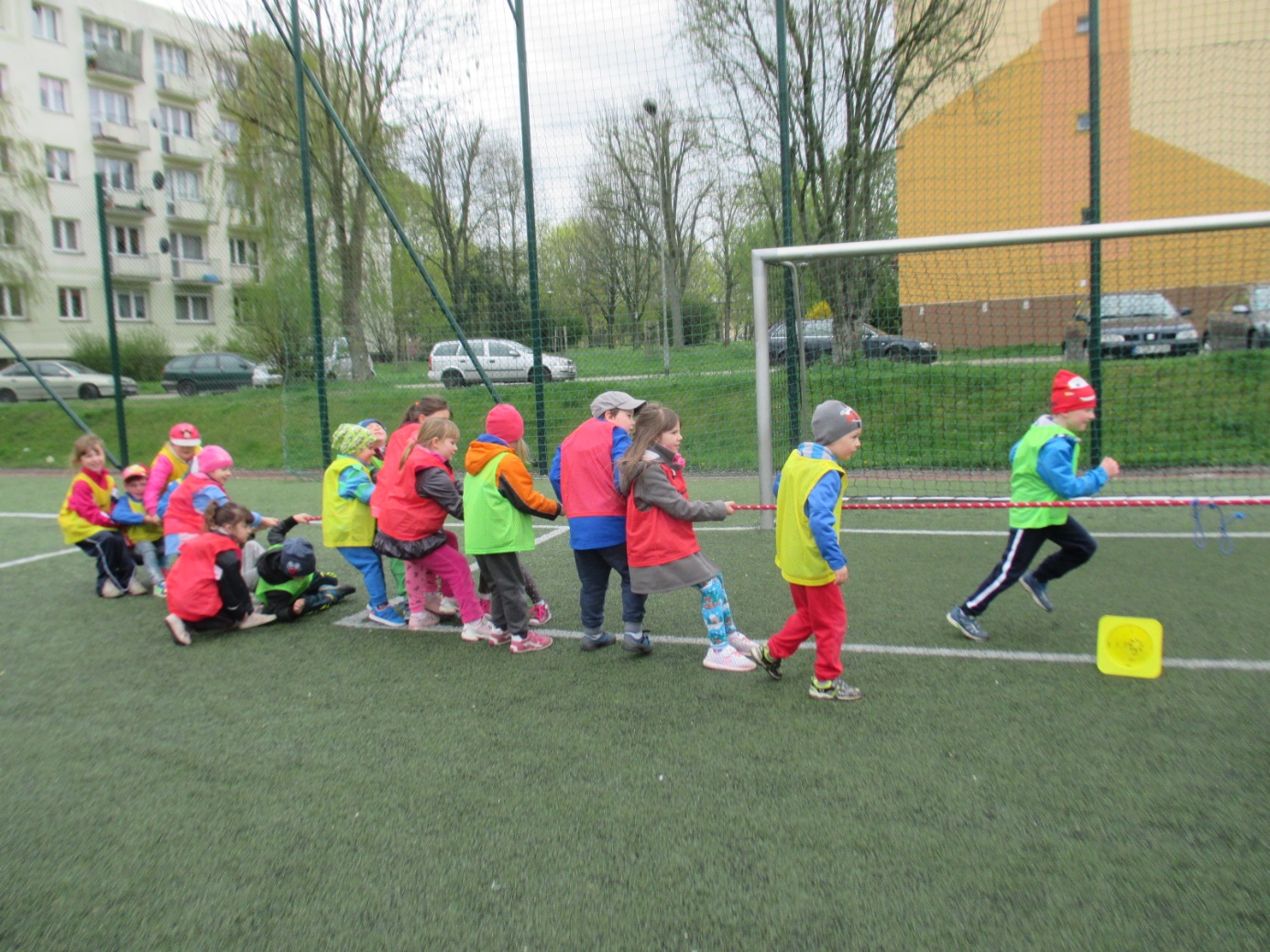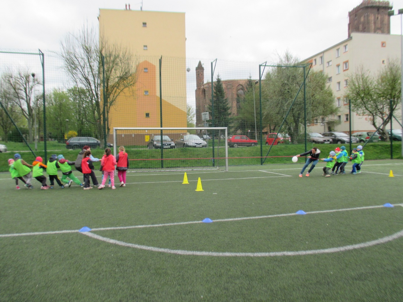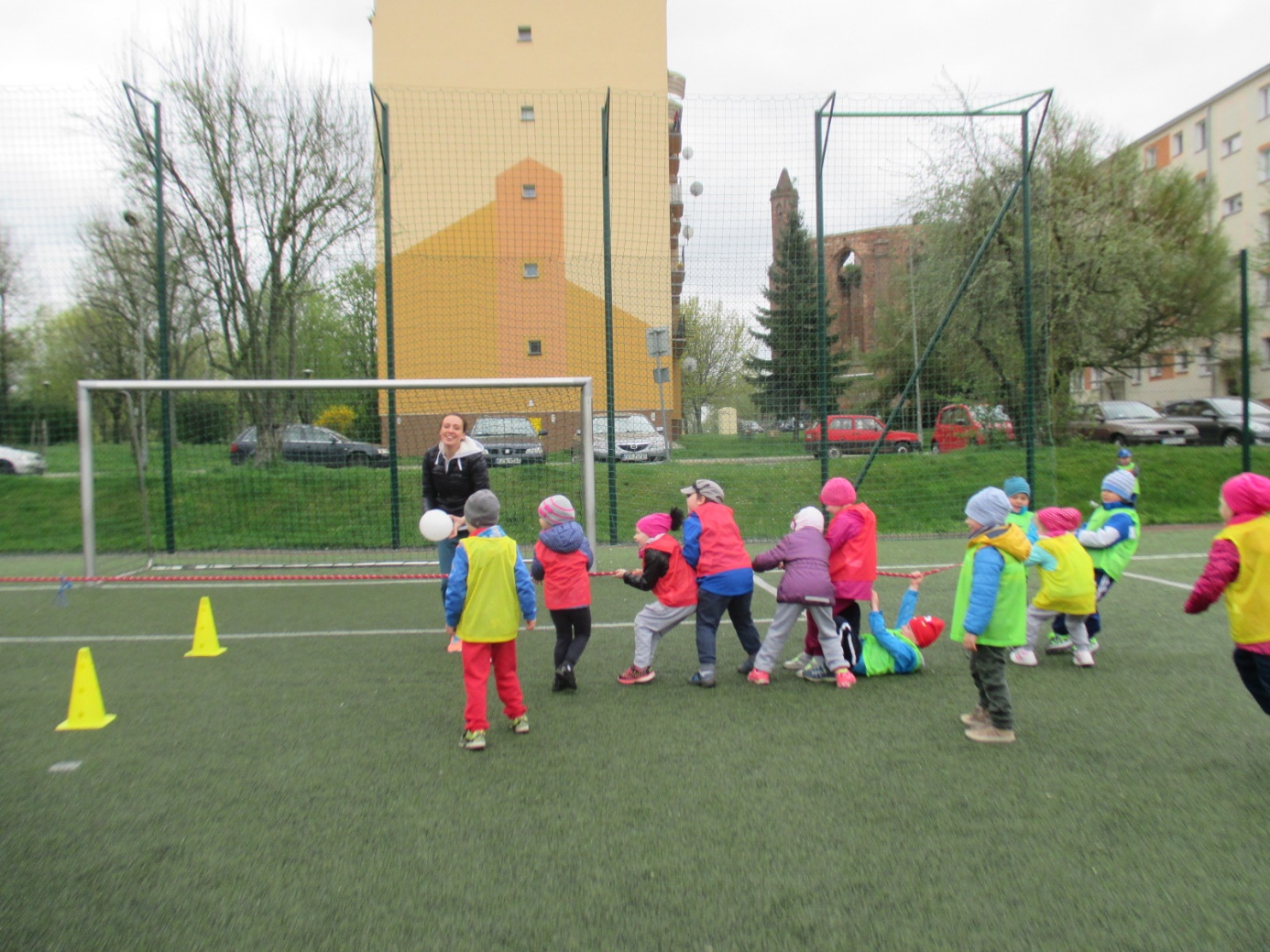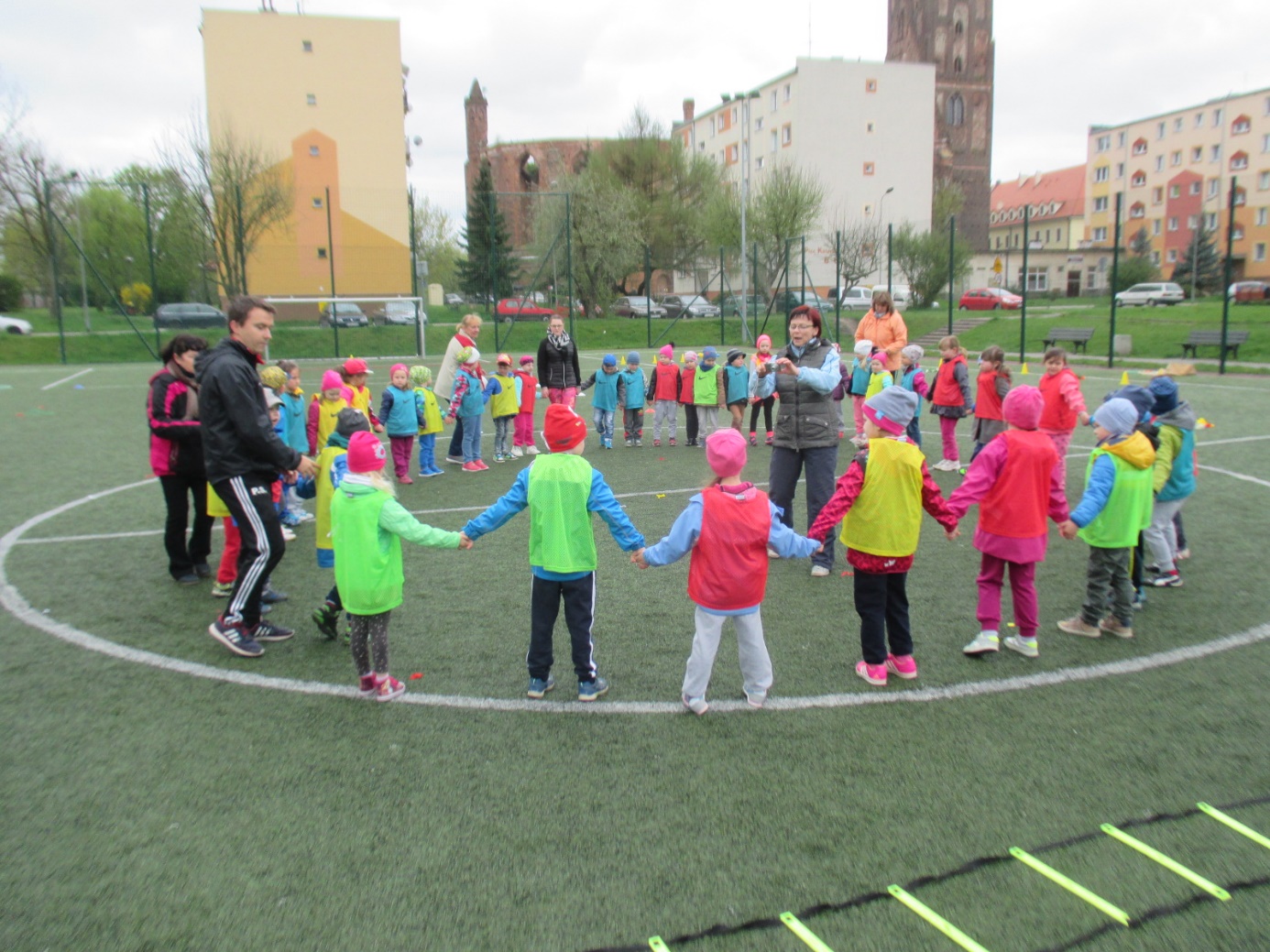 Gubińskie Przedszkole Miejskie Nr 1 już od kilku lat współpracuje z placówką przedszkolną „Regenbogen” z Guben. Przedszkolaki spotykają się wspólnie podczas różnych okoliczności. Tym razem dzieci 5-letnie zaprosiły swoich rówieśników z Przedszkola „Regenbogen” z Guben do wspólnych sportowych zmagań. Spotkanie odbyło się w dniu 20.04.2016 r. na „Boisku „Orlik” przy ulicy Roosevelta. Celem wspólnego spotkania dzieci polskich i niemieckich była integracja przedszkolaków przez wspólną zabawę, wspomaganie rozwoju fizycznego poprzez udział w poszczególnych konkurencjach sportowych oraz kształtowanie formy rywalizacji sportowej z zachowaniem zasad fair-play. Spotkanie rozpoczęły zabawy integracyjne w dużym kręgu z wykorzystaniem pomponów w barwach Polski i Niemiec oraz kolorowych wstążek. To było pełne atrakcji przedpołudnie i południe, bo każdy mógł spróbować swoich sił w różnych konkurencjach sportowych. Wszystkie dzieci zostały podzielone na 4 polsko-niemieckie grupy oznaczone koszulkami w kolorze czerwonym, zielonym, żółtym i niebieskim. Nad całością przebiegu sportowych zmagań czuwał m.in. trener-instruktor sportowy z Miejskiego Ośrodka Sportu Pan Patryk Sobolewski, który przeprowadził z dziećmi „mini” mecze piłkarskie. Ponadto przedszkolaki brały udział w przygotowanych konkurencjach sportowych i zręcznościowych metodą stacyjną: rzucanie woreczkami do celu, ciągnięcie liny, drabinkowy tor przeszkód, kopanie piłek do celu-bramki, zabawy zręcznościowe w przenoszeniu piłek „na łyżce” do wyznaczonego celu, skoki na skakankach, przechodzenie w tunelu, zabawy z obręczami hula –hop. Podczas sportowych zmagań nie zabrakło zdrowego poczęstunku i zabaw plastycznych podczas których dzieci wykonywały „piłki” do ułożonego z kwiatów slalomowego toru oraz  podsumowujących spotkanie. Na  zakończenie sportowych zmagań wszyscy uczestnicy otrzymali medale zdrowego i aktywnego przedszkolaka oraz zdrowe niespodzianki. Spotkanie zakończyło się wspólnych wyjściem do Restauracji Mc Donald’s. Udział w sportowych zmaganiach był dla dzieci niezwykłym przeżyciem i w bardzo znaczący sposób wpłynął na zacieśnienie przyjaźni między rówieśnikami polskimi i niemieckimi, a także kadrą biorącą udział w spotkaniu. Wszystkim zabawom i konkurencjom towarzyszyły gorące emocje. Bardzo dziękujemy za pomoc w organizacji spotkania Miejskiemu Ośrodkowi Sportu w Gubinie, Wydziału Europejskiemu przy Urzędzie Miejskim oraz Zakładowi Produkcyjnemu „Fructofresch” Group Spółka z o o w Czarnowicach gm. Gubin. Polsko-niemieckie spotkania dzieci i kadry organizowane w ramach PWNM stwarzają możliwość przygotowania dzieci już od najwcześniejszych lat do życia w wielokulturowym i zintegrowanym społeczeństwie. Dzieci mają okazję rozwijania umiejętności współdziałania między rówieśnikami polskimi i niemieckimi oraz do poznawania języka sąsiadów, pokonywanie bariery językowej i zacieśniania kontaktów między sobą, co w dużej mierze przyczynia się do kontynuowania jeszcze owocniejszej i trwalszej współpracy.